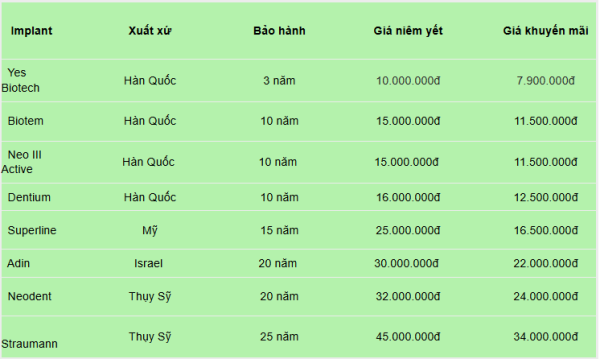 Dưới đây là bảng giá trồng răng Implant tại Nha khoa Thùy Anh