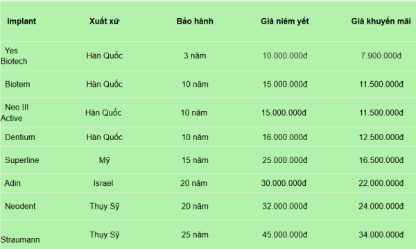 Chi phí trụ implant Hàn Quốc tại Nha khoa Thùy Anh Hiện nay dao động từ khoảng 10.000.000đ đến 16.000.000đ/trụ. Dưới đây là bảng giá trồng răng implant chi tiết tại Thùy Anh: